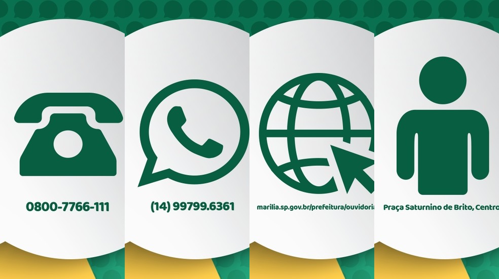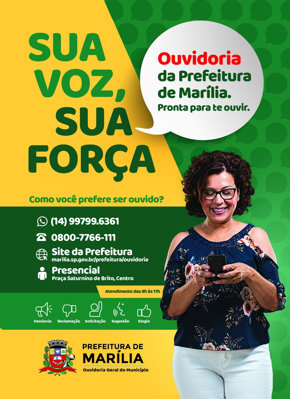 Além desse canal, a Ouvidoria Geral do Município presta atendimento presencial (rua 4 de Abril, 41, Praça Saturnino de Brito, centro da cidade), pelo telefone 0800 776 6111 e através do site da prefeitura: www.marilia.sp.gov.br/prefeitura/ouvidoria.